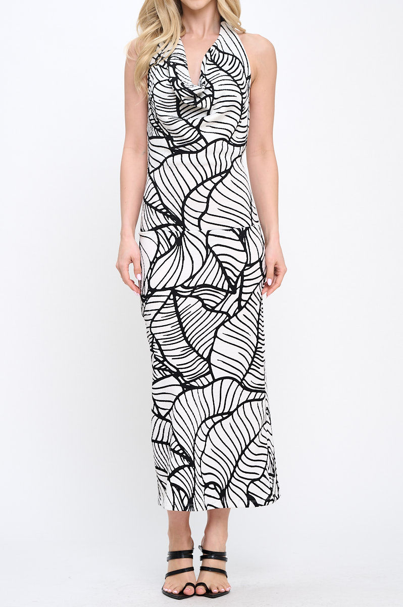 Abstract Print Halter Cowl neck Dress with Open Back and Slit